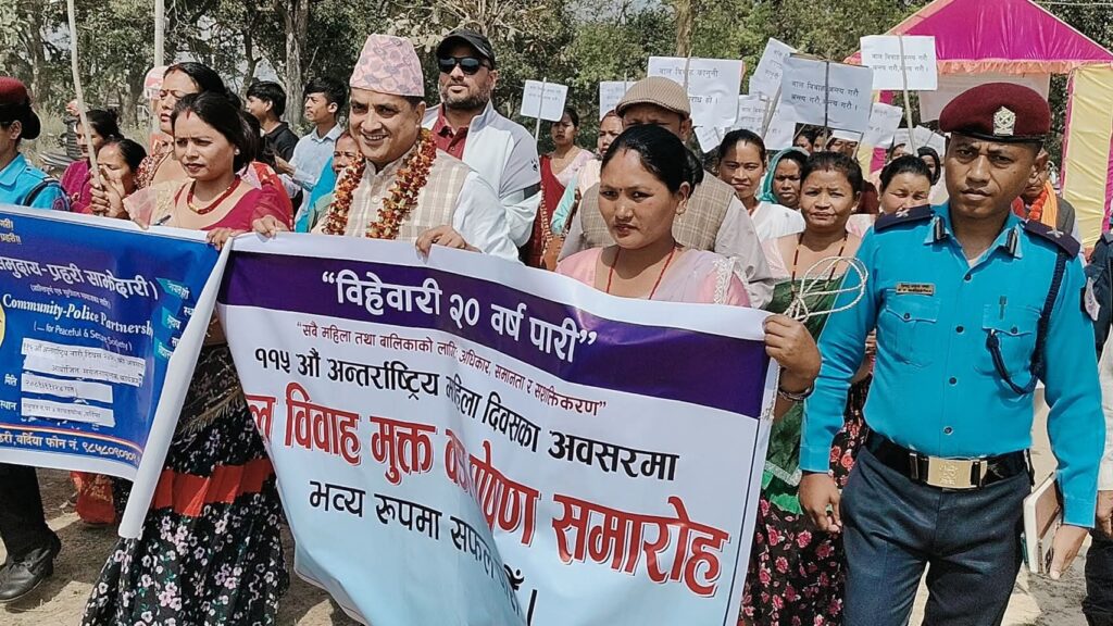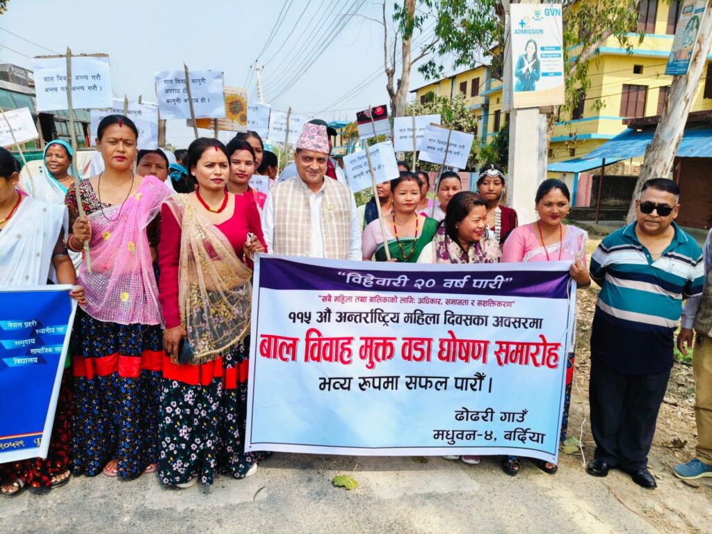 ज्योति पन्थी बर्दिया । लुम्बिनी प्रदेशका सामाजिक विकास मन्त्री जन्मजय तिमिल्सिनाले बालविवाह र महिला हिंसा रोक्नका लागि महिला आफै सक्रिय हुनुपर्ने बताउनुभएको छ। नगरपालिका वडा नम्बर ४ लाई बालविवाहमुक्त वडा घोषणा गर्न आयोजना गरेको कार्यक्रममा मन्त्री तिमिल्सिनाले उक्त कुरा बताउनुभएको हो।