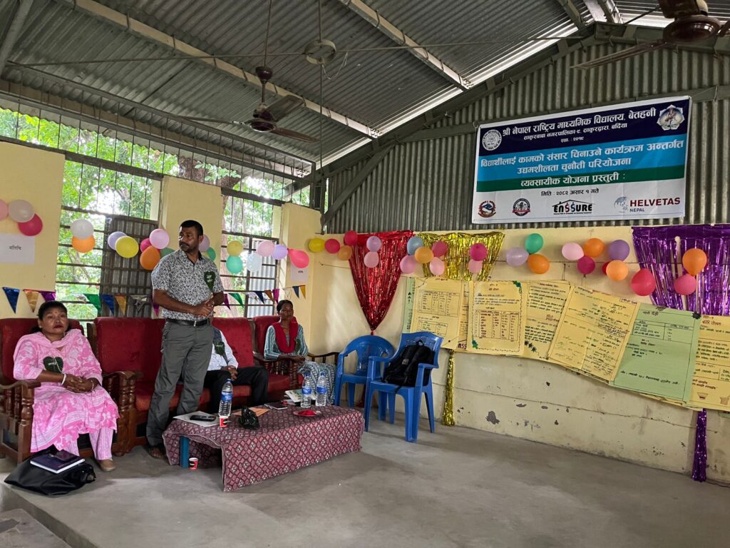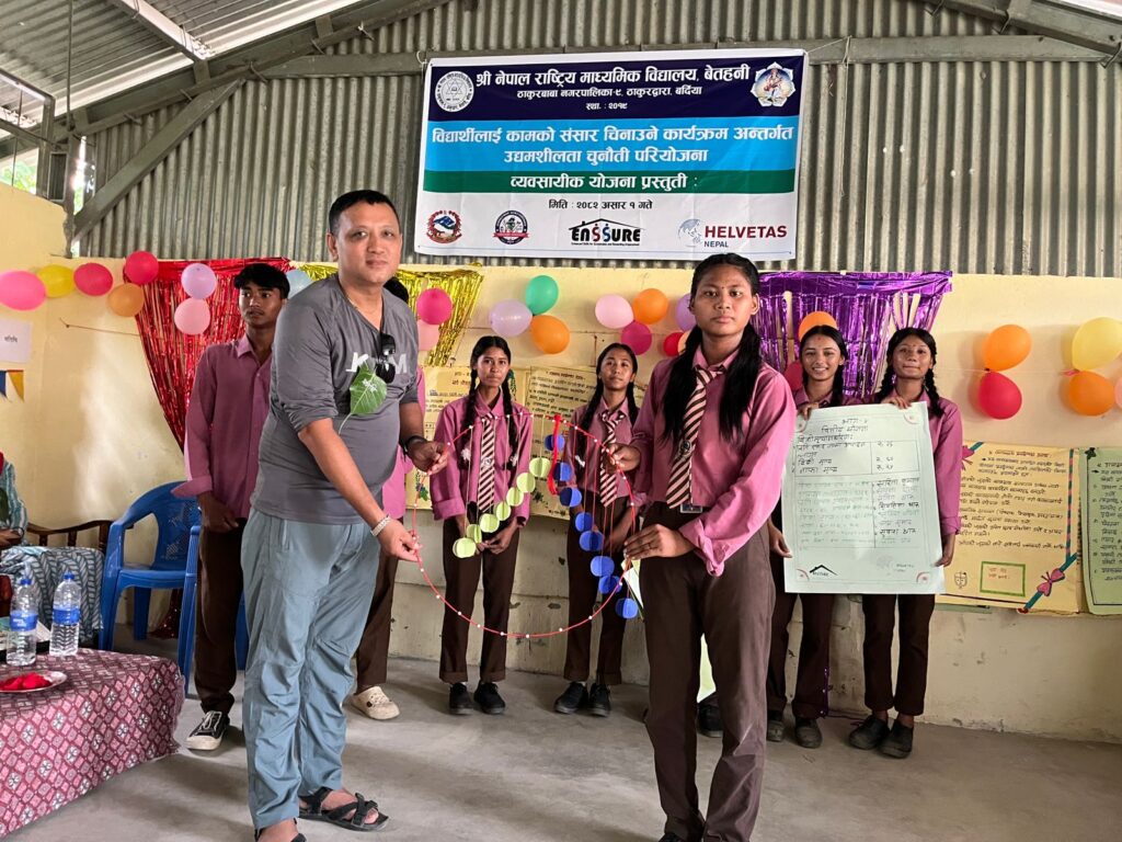 बर्दिया असार १ गते । आज बर्दियाको ठाकुरद्धारमा रहेको नेपाल राष्ट्रिय माध्यामिक विद्यालय, ठाकुरद्धारामा विद्यार्थीहरुलाई कामको संसार चिनाउने कार्यक्रम अन्तर्गत उद्यमशिलता चुनौति परियोजनाको व्यवसायीक योजना प्रस्तुति कार्यक्रम सम्पन्न भएको हो ।