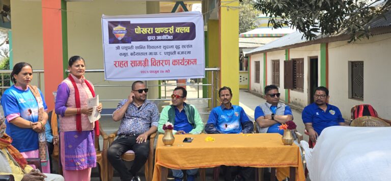 ज्योति पन्थी बर्दिया । पोखरा थन्डर्स क्लबले बर्दिया जिल्लाको बढैयाताल गाउँपालिका वडा नं ८ मा रहेको पशुपति शान्ति शिवालय सुधामा वृद्ध सत्संग समूहलाई राहत